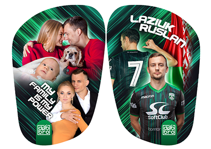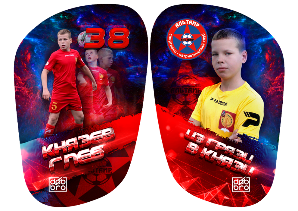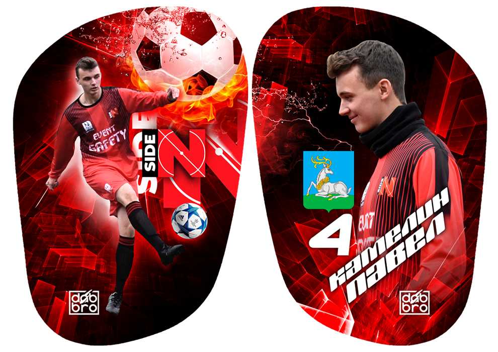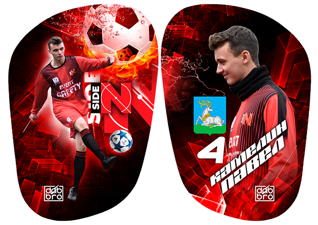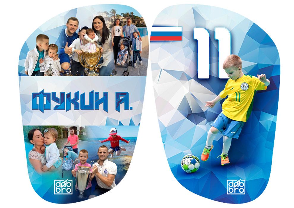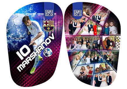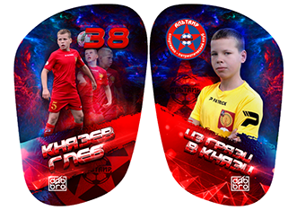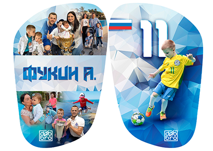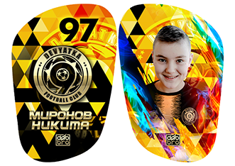 Разрабатывается специальный дизайн для футбольной школы исходя из цветовой гаммы клуба и его логотипа. На щитки наносится фамилия игрока, его игровой номер, год рождения.