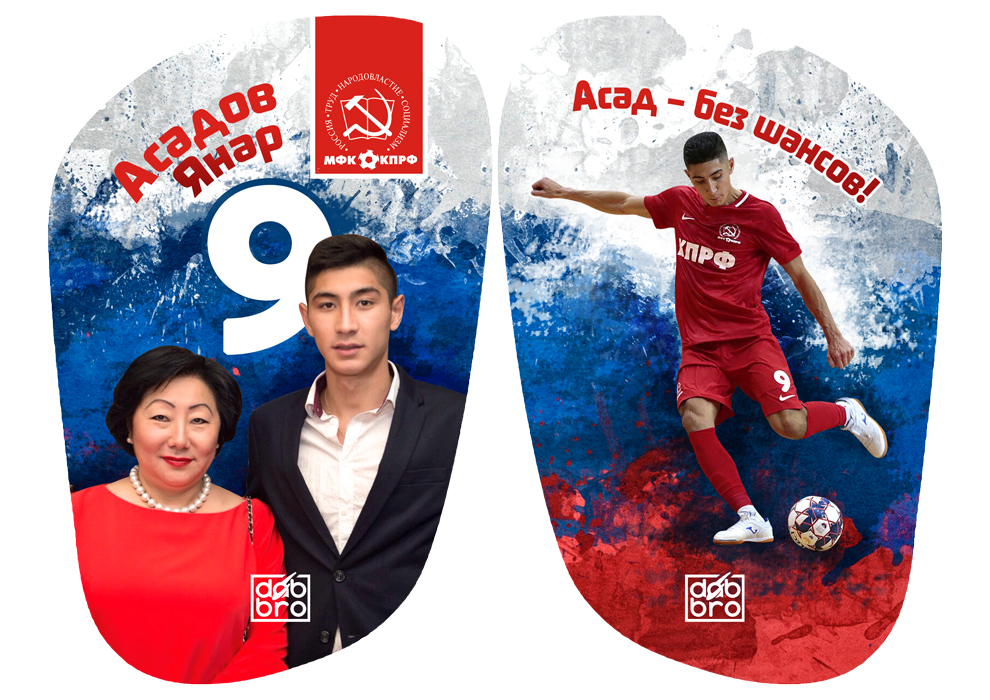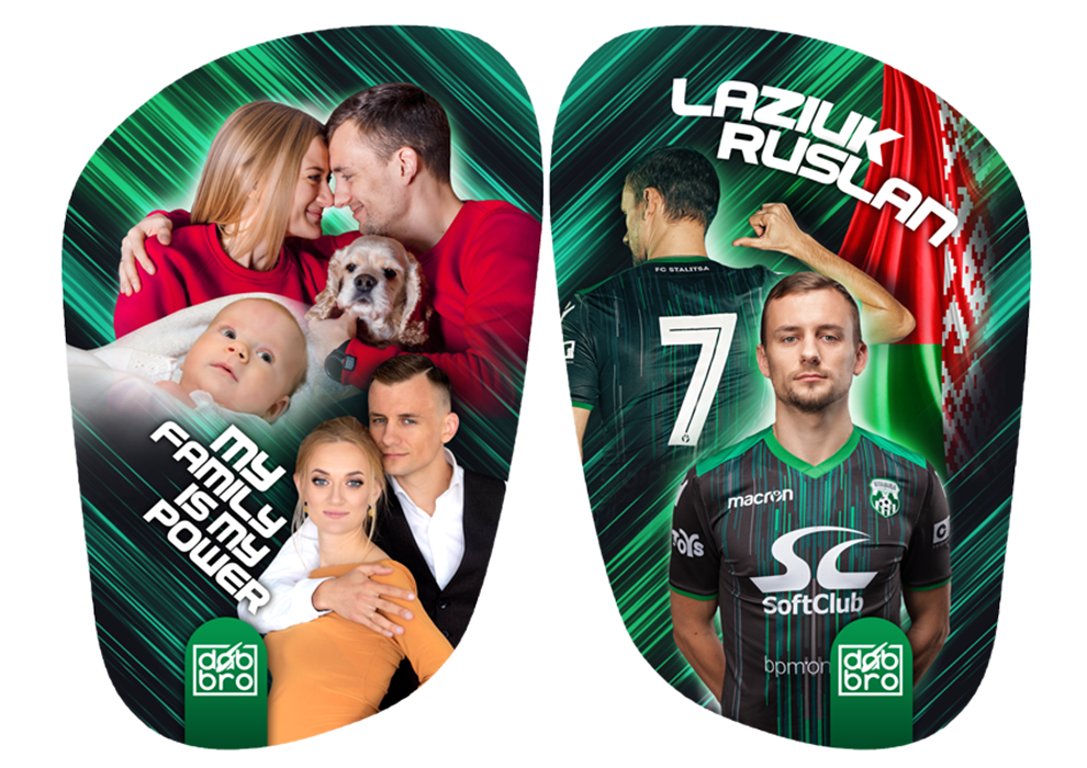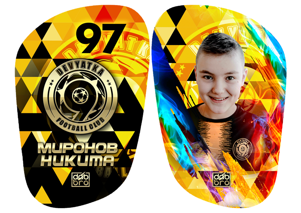 Разрабатывается специальный дизайн для футбольной школы исходя из цветовой гаммы клуба и его логотипа. На щитки наносится фамилия игрока, его игровой номер, год рождения.