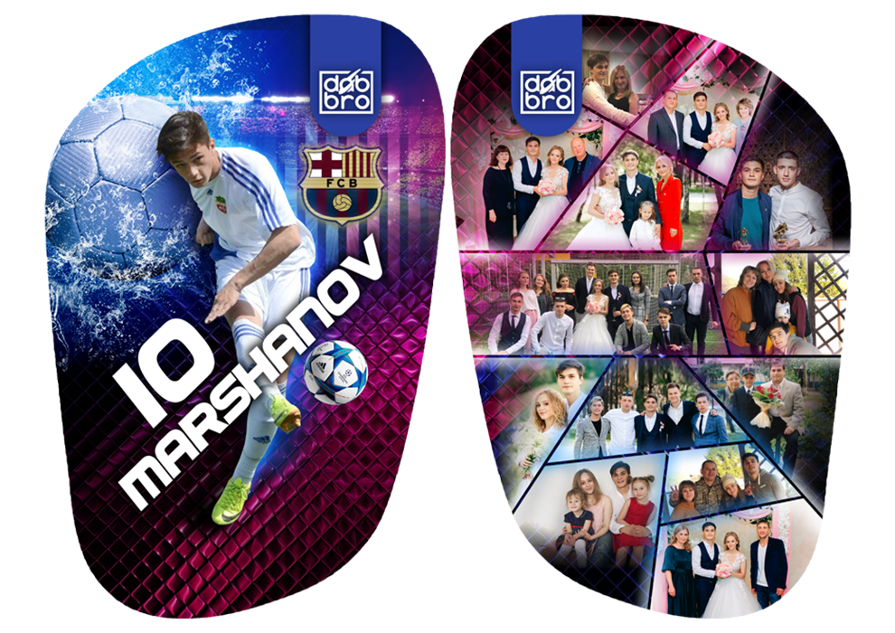 В эту стоимость входит (разработка индивидуального дизайна по просьбе заказчика, обработка любого количества фотографий присланные заказчиком, нанесения коллажа на щиток, цвета клуба, эмблема клуба, надписи, номер футболиста и прочее)